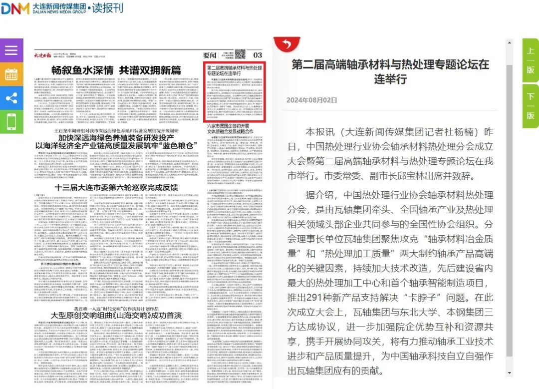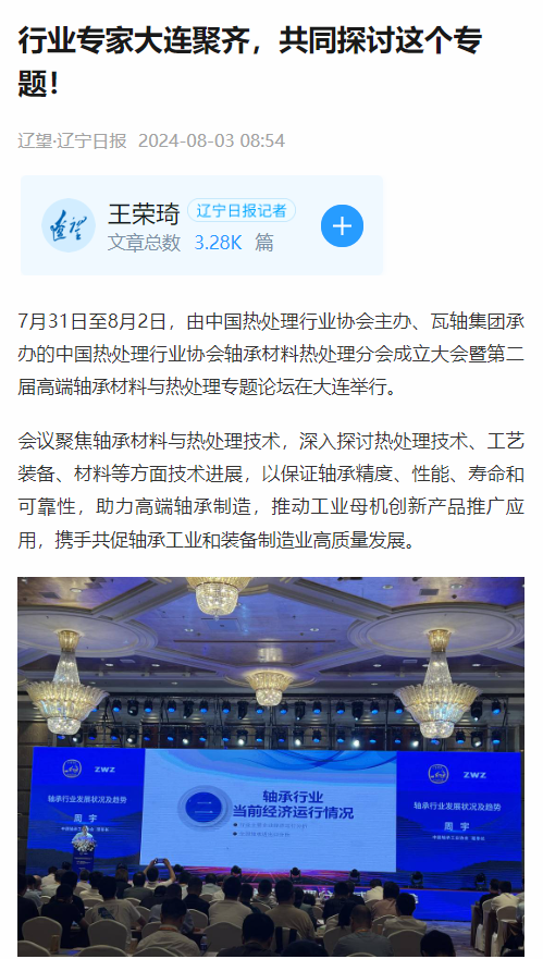 7月31日至8月2日,由中國熱處理行業(yè)協(xié)會主辦、瓦軸集團(tuán)承辦的中國熱處理行業(yè)協(xié)會軸承材料熱處理分會成立大會暨第二屆高端軸承材料與熱處理專題論壇在大連香格里拉酒店舉行。會議聚焦軸承材料與熱處理技術(shù),深入探討熱處理技術(shù)、工藝裝備、材料等方面技術(shù)進(jìn)展,助力高端軸承制造,推動工業(yè)母機(jī)創(chuàng)新產(chǎn)品推廣應(yīng)用,攜手共促軸承工業(yè)和裝備制造業(yè)高質(zhì)量發(fā)展。來自國內(nèi)外軸承材料及熱處理相關(guān)單位技術(shù)人員、行業(yè)專家近300人參加會議。