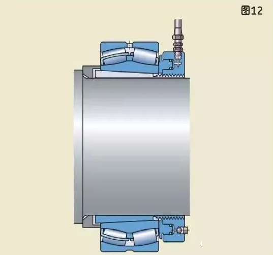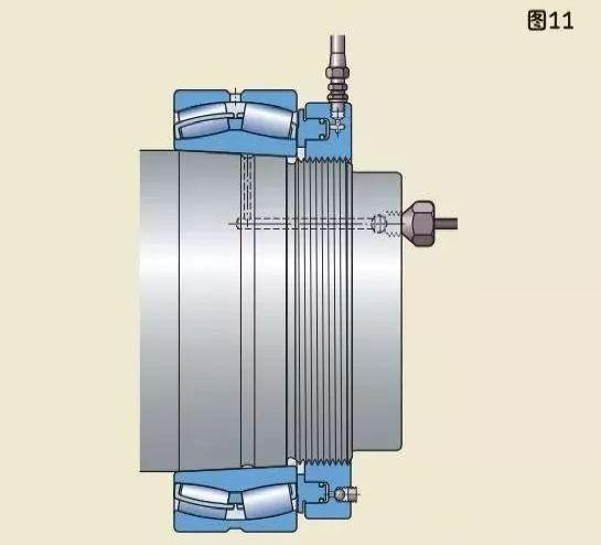 較大軸承需要更大的力來安裝,因此應使用液壓螺母。液壓螺母可以把圓錐孔軸承安裝在圓錐形軸徑上(圖11),緊定套上(圖12),退卸套上(圖13)。