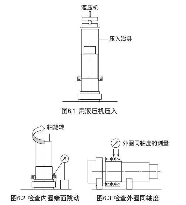 然后,在壓入內圈時,應使用內圈壓入工具,確實將其壓入軸肩(請勿向外圈加力)。壓入后,測量軸承各部位的精度,確認是否確實安裝在軸上。另外,組配使用多列軸承時,在組裝后應測量其跳動,修正外圈間的軸心偏差。