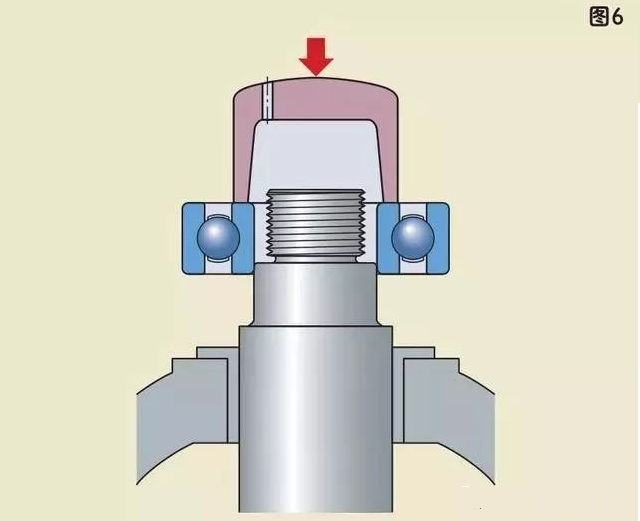 安裝配合不是太緊的小軸承時,可以通過一個套筒(圖5、圖6)并以錘擊的方法,輕輕敲擊套筒把軸承裝到合適的位置。敲擊時應盡量均勻的作用在軸承套圈上,以防止軸承傾斜或歪斜。